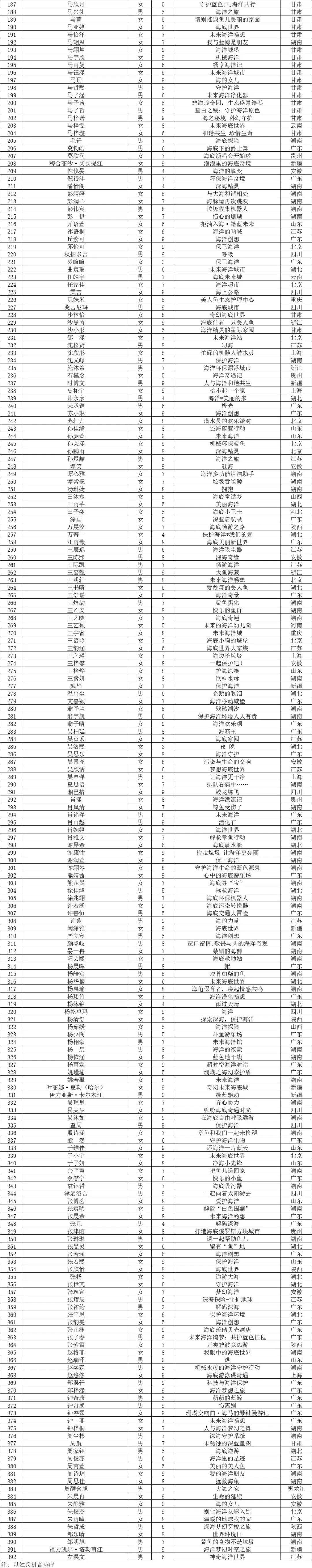 由中国宋庆龄基金会和星云文化教育公益金会联合举办的“未来海洋畅想——第八届国际少儿环保公益绘画大赛”,评审委员们及主办单位经过初审、复审等反复斟酌和评议后,最终评选出968名优胜奖,其中优胜奖境内少儿组392名。所有获奖者将获得荣誉证书,将于6月29日颁奖典礼结束后分批次寄出。现公布优胜奖境内少儿组获奖名单如下: